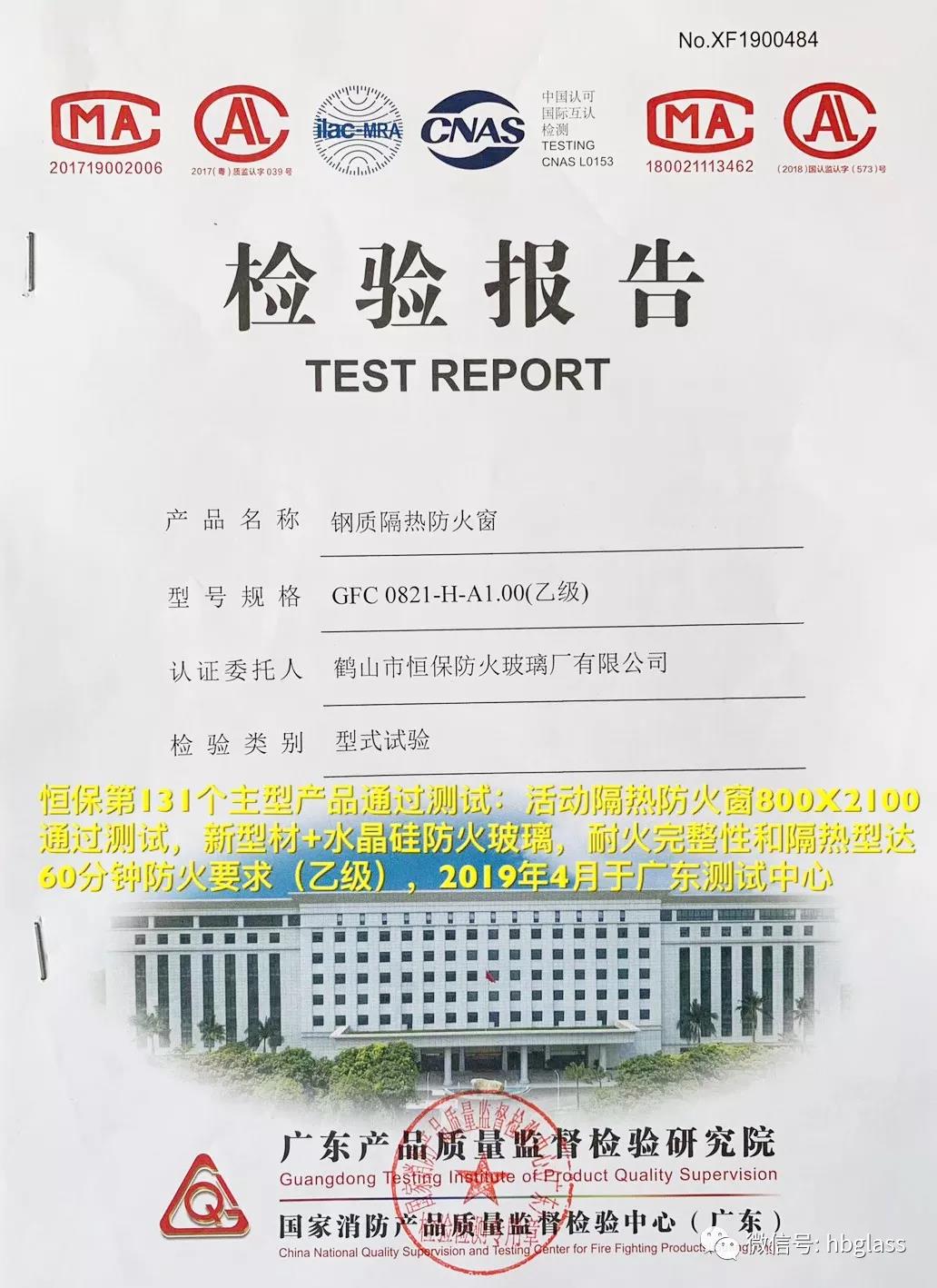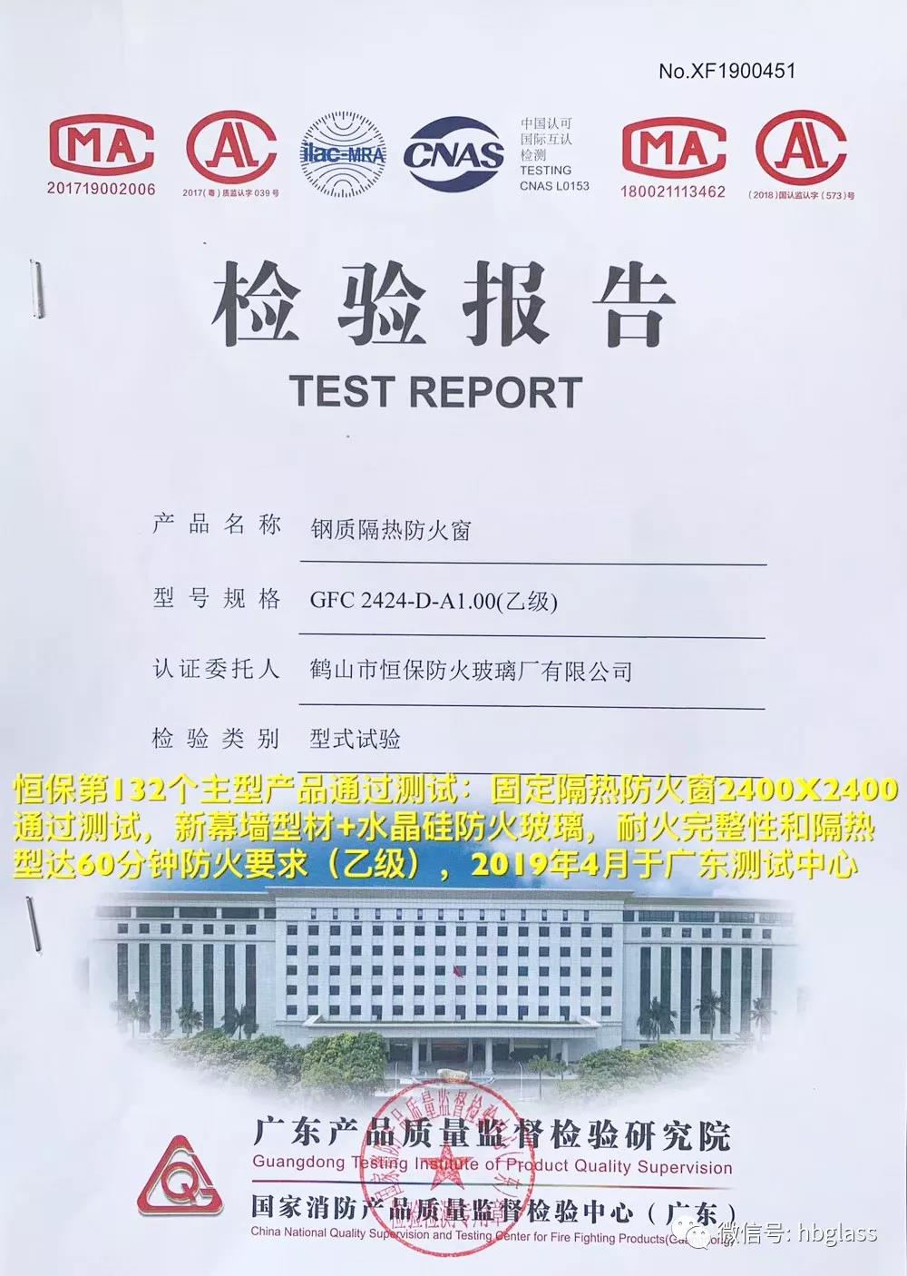 恒保第132個主型產(chǎn)品通過測試:2019年4月于廣東測試中心,恒保公司送檢的固定隔熱防火窗(2400X2400,新幕墻型材+福普思水晶硅防火玻璃),通過耐火完整性和隔熱型達(dá)60分鐘防火要求(乙級)測試要求,并獲得檢測合格報告。國家強(qiáng)制性CCC認(rèn)證證書正在申請中。