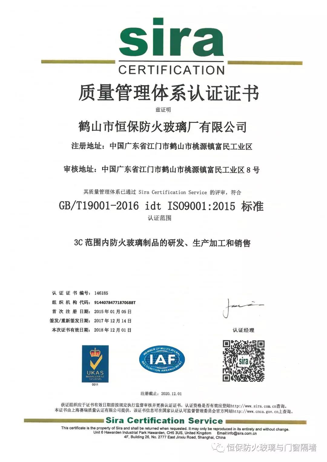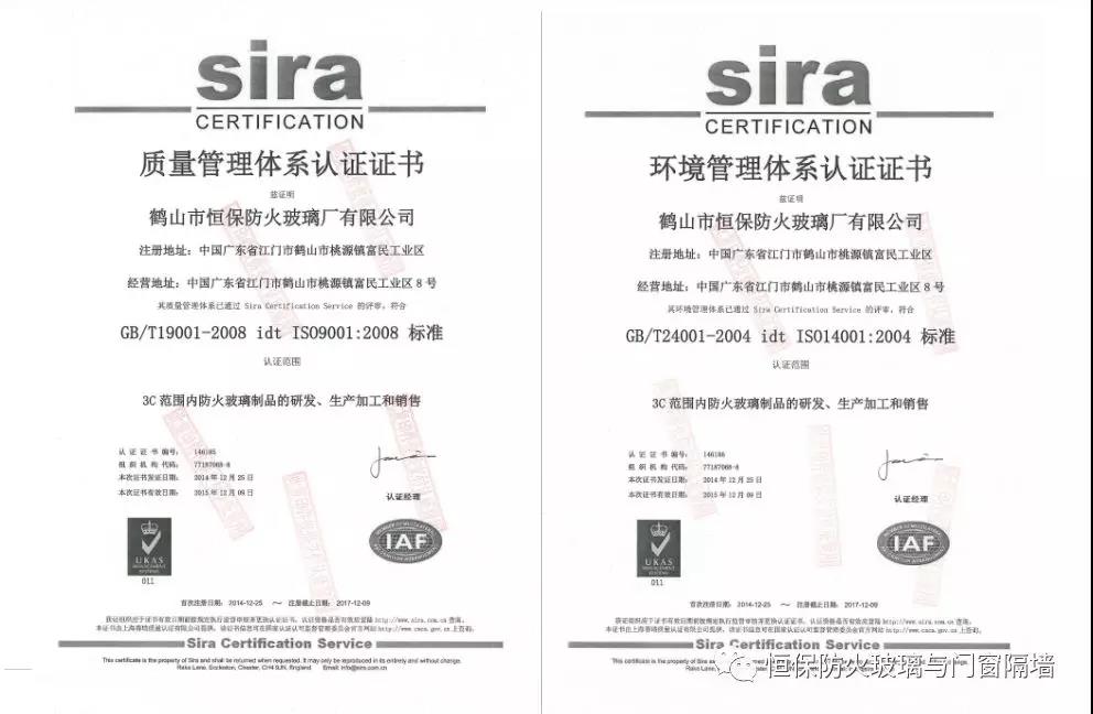 鶴山市恒保防火玻璃廠有限公司,自2014年第一次獲得ISO9001-2008質(zhì)量管理體系、ISO14001-2008環(huán)境管理體系認證。并與原企業(yè)管理體系相結合,與CCC強制性認證產(chǎn)品企業(yè)管理體系相融合,建立了更完善的科研、開發(fā)、生產(chǎn)、銷售和售后服務體系,使恒保公司穩(wěn)健快速增長。