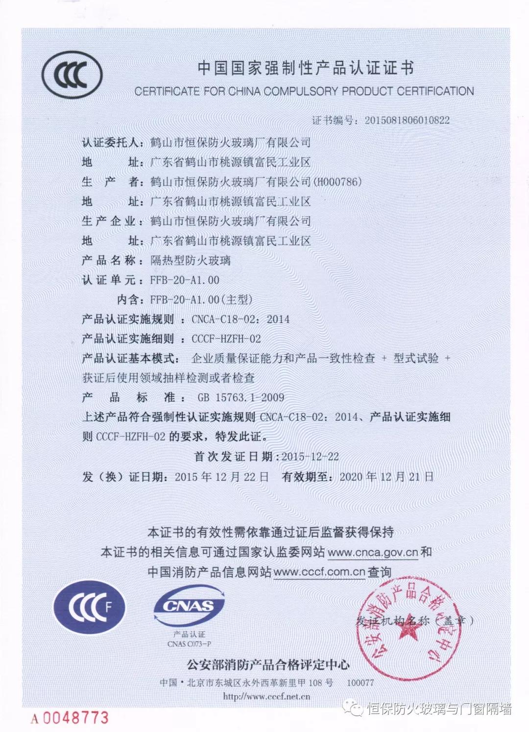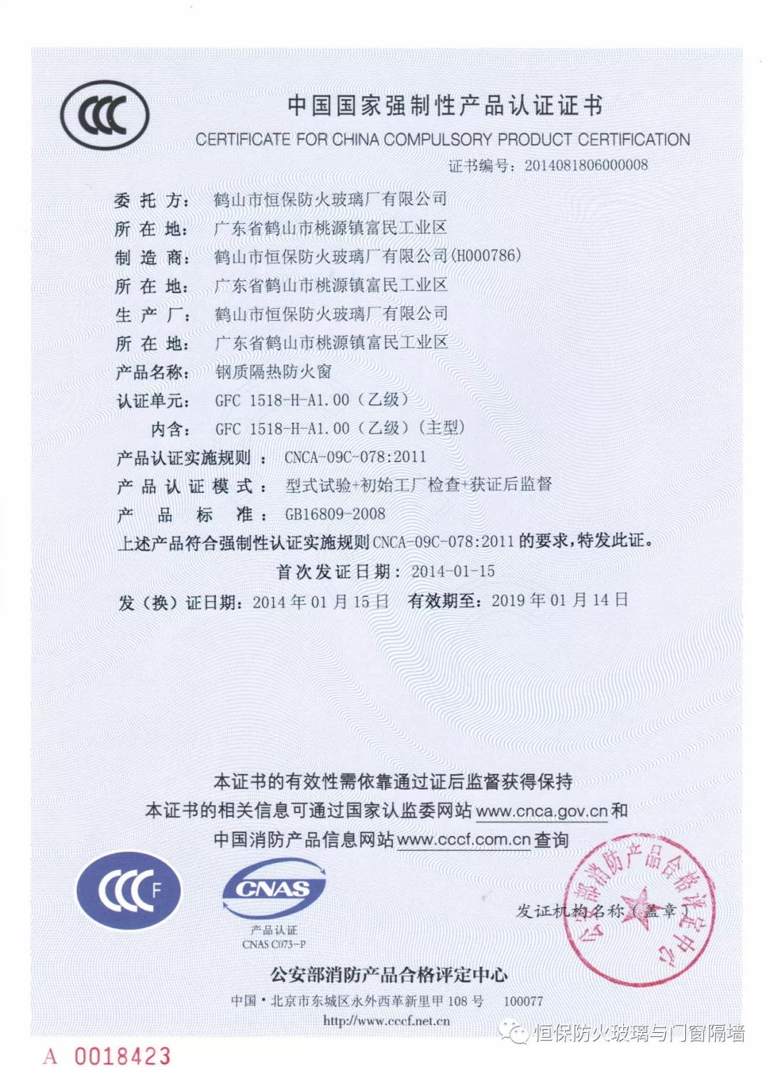 4.恒保公司一共12個(gè)產(chǎn)品獲得國(guó)家3C認(rèn)證證書,2小時(shí)和3小時(shí)鋼質(zhì)隔熱防火窗更是國(guó)家首個(gè)通過(guò)國(guó)家認(rèn)證的產(chǎn)品;