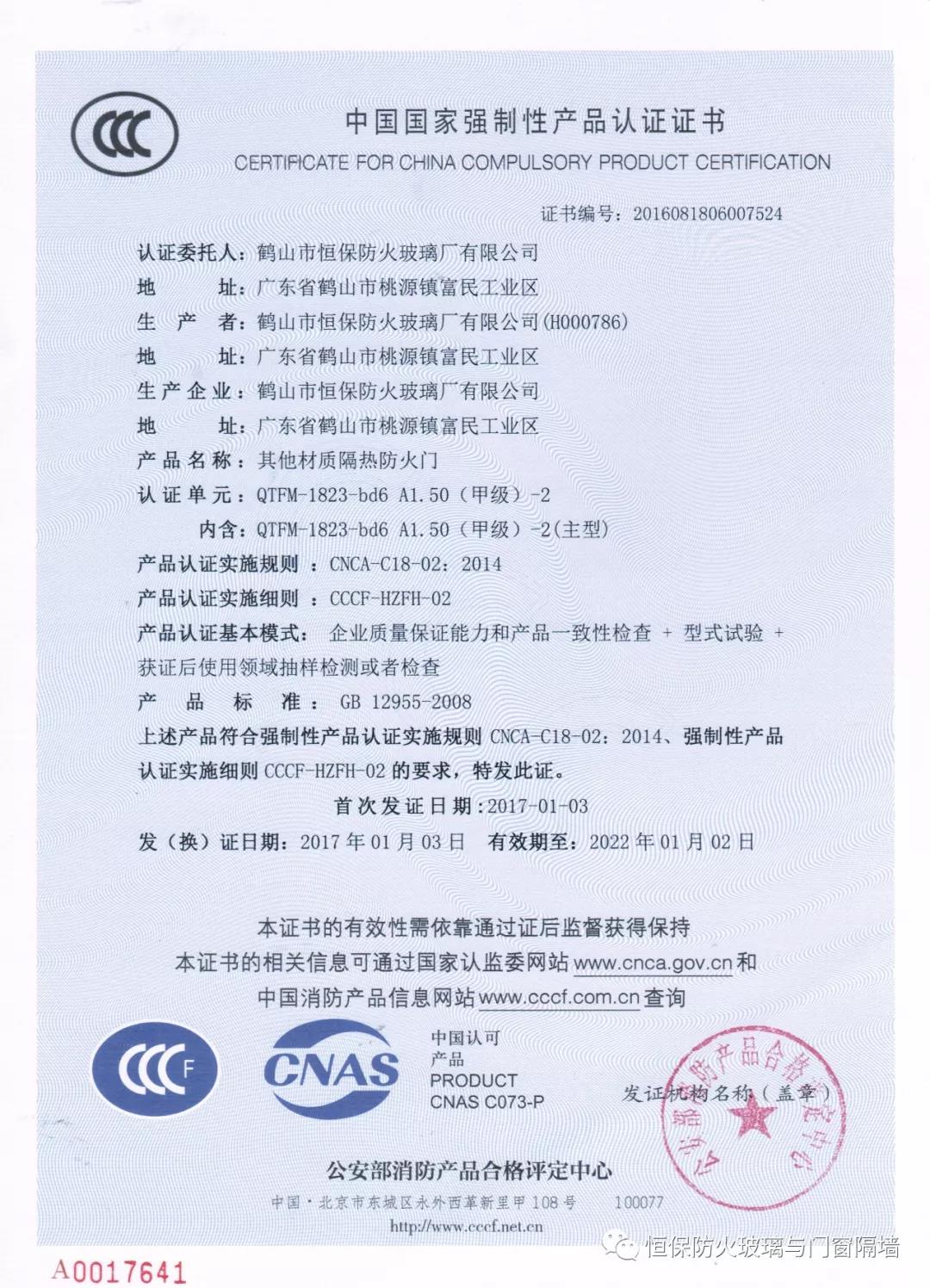 5、恒保公司一共6個(gè)產(chǎn)品獲得國(guó)家3C認(rèn)證證書,其中大版面玻璃防火門2100mmX3000mm;