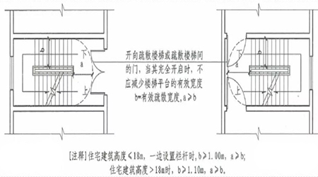 3、開向疏散樓梯或疏散樓梯間的門,當其完全開啟時,不應減少樓梯平臺的有效寬度。(6.4.11)